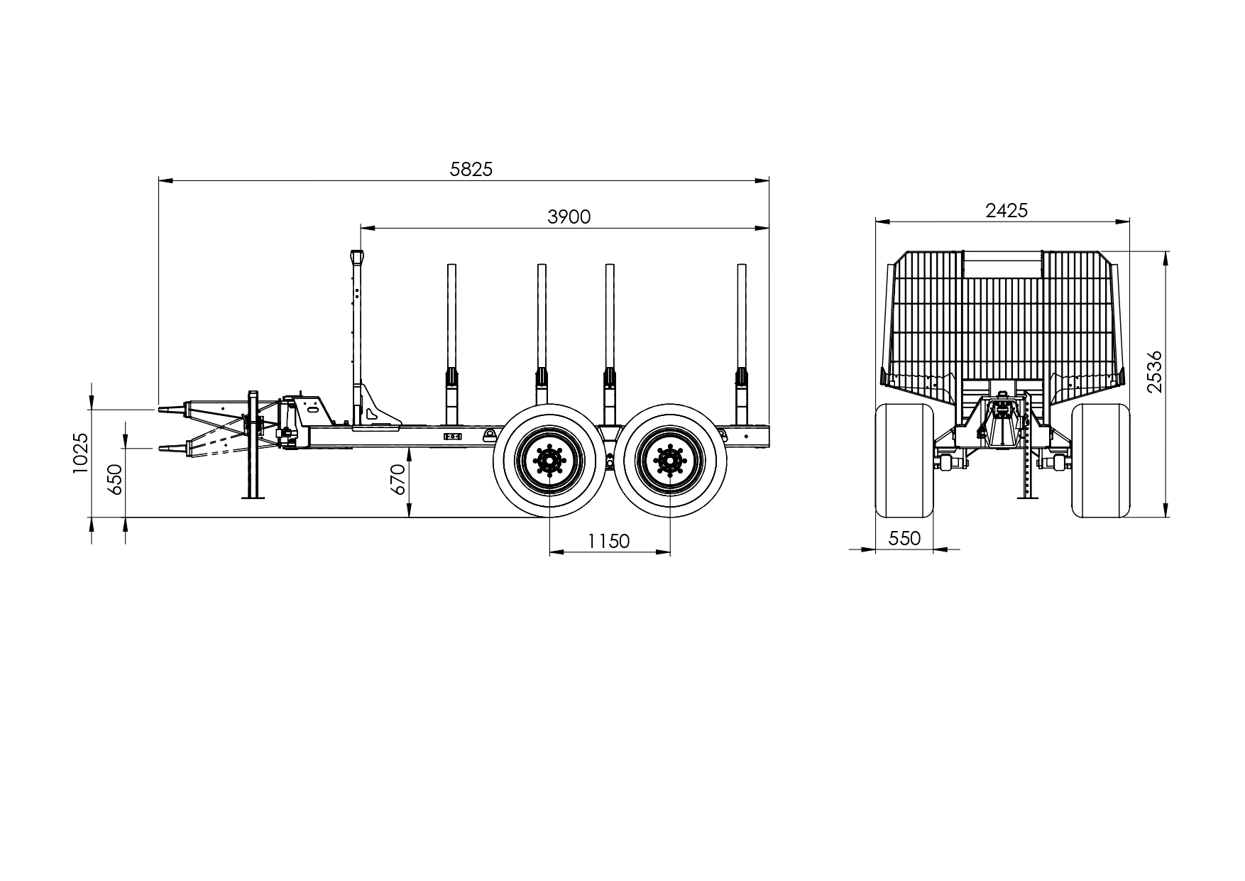 A rakodófelület mérete 2,2–2,5 m², amely elegendő helyet biztosít a rönkök biztonságos elhelyezéséhez. A pótkocsi kialakítása lehetővé teszi különböző erdészeti kiegészítők, például daru vagy egyéb opciók integrálását is, így a gép könnyen az adott felhasználási igényekhez igazítható.