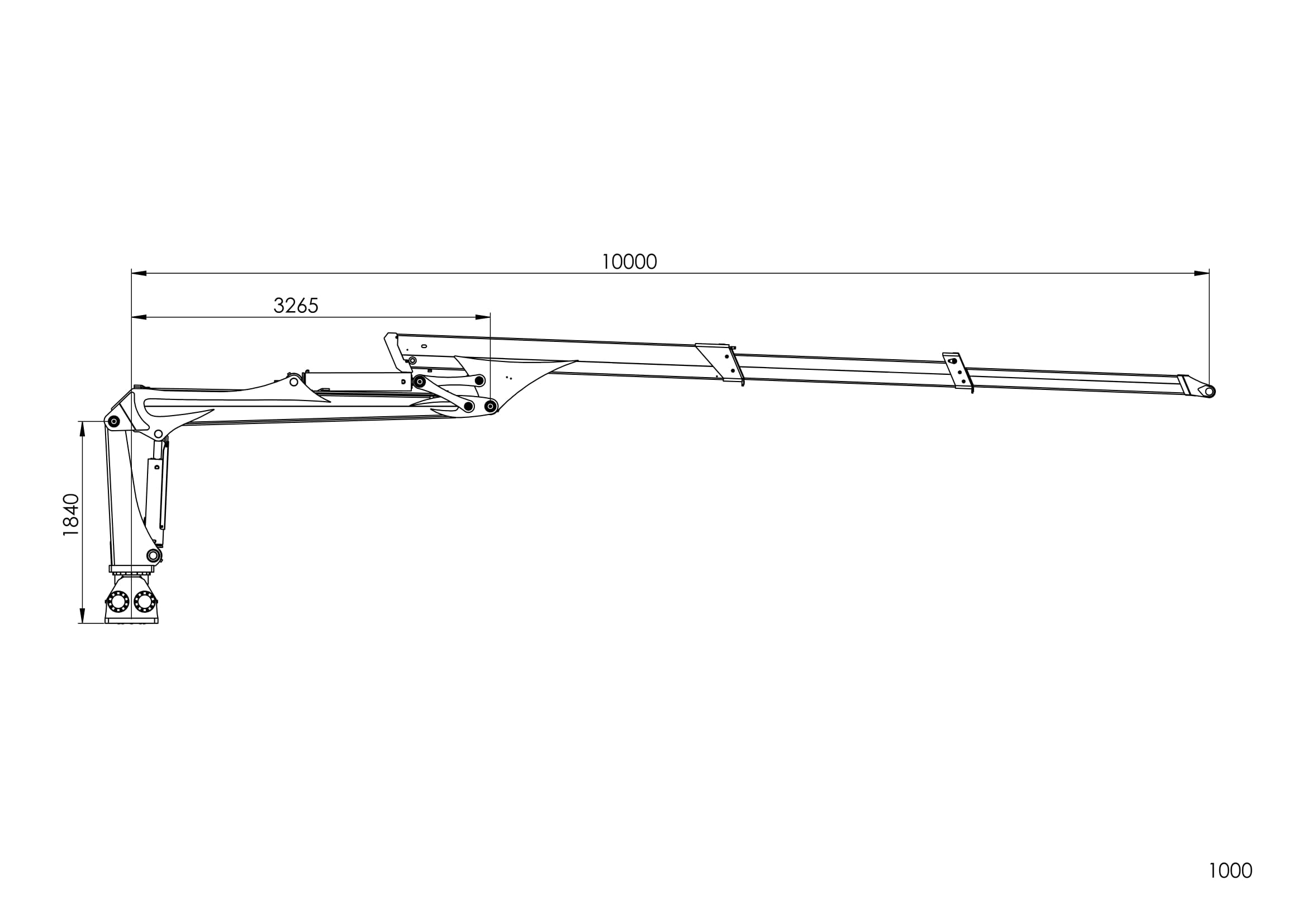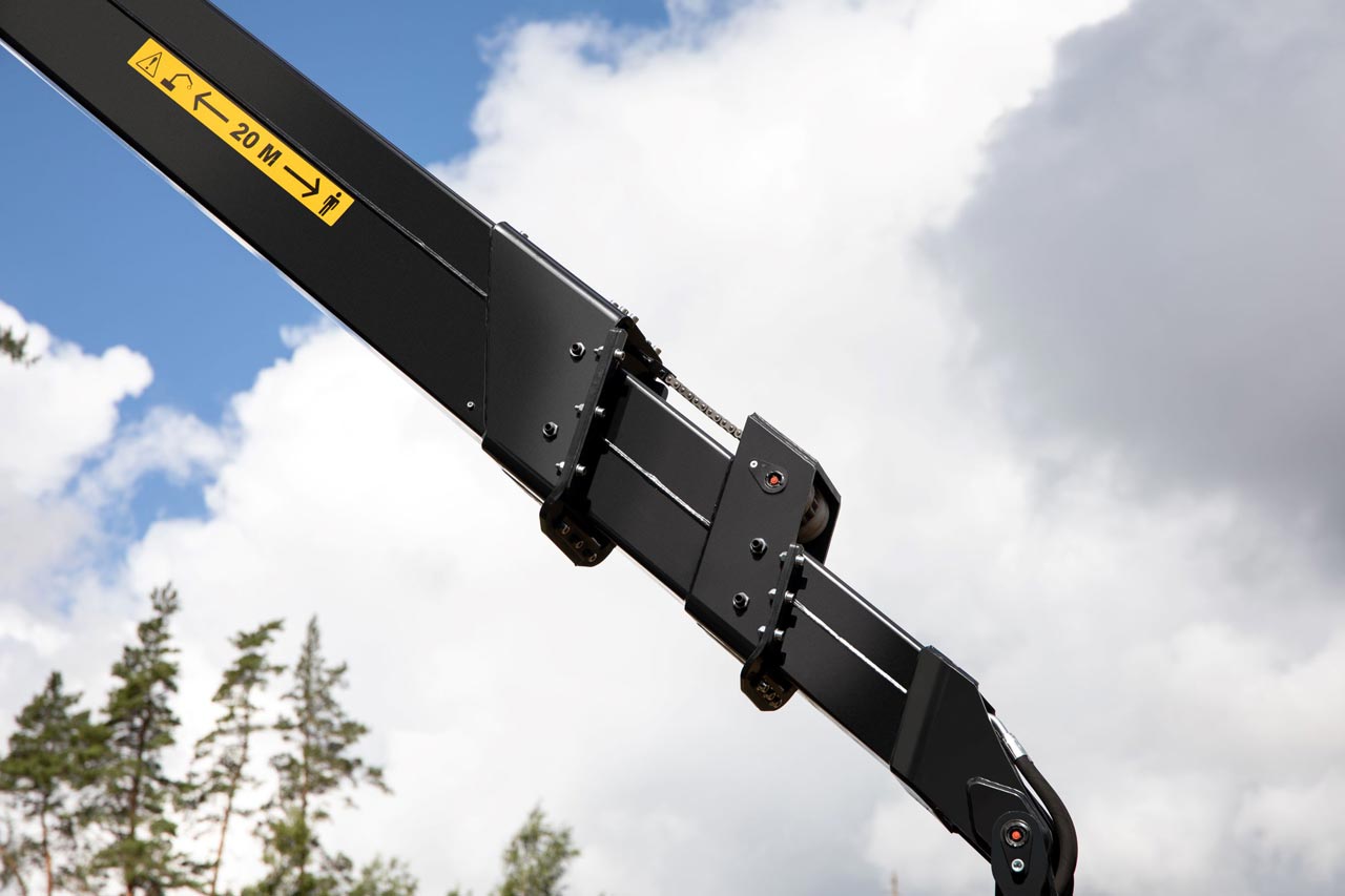 Erőteljes daru, maximális hatótávolsága 10 m, széles szögű csukló és kettős teleszkóp.